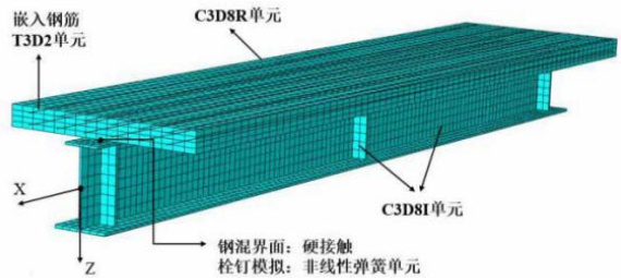 非线性分析采用 ABAQUS,混凝土部分采用实体单元 C3D8R、钢梁采用 C3D8I 单元来模拟。栓钉连接件采用非线性弹簧单元来模拟,并赋予其非线性荷载-滑移关系。混凝土和钢应力应变关系参考文献[11],混凝土拉伸开裂后的软化行为由拉伸强化模型来定义,即在达到峰值拉应力后线性折减,直至应变为 0.1 时应力降为 0 。模型如图 12