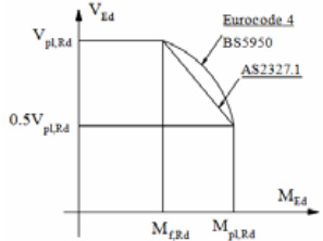 MRd 为纯弯状态下组合梁的抗弯承载力,由塑性设计理论计算而得, Mf,Rd 为仅考虑混凝土板和钢梁翼缘所提供的抗弯承载力。这些规范都仅在设计剪力 VEd 大于组合梁抗剪承载力Vpl,Rd 的一半时才会应用上述公式进行折减。