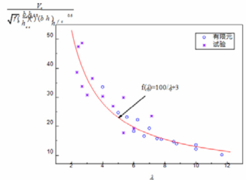 式中: fc 为混凝土的轴心抗压强度, a 为弯剪比,翼缘板剪跨比 λc=α/hco 本公式考虑了弯剪比的影响,因此适用于发生剪切破坏的组合梁抗剪强度计算。