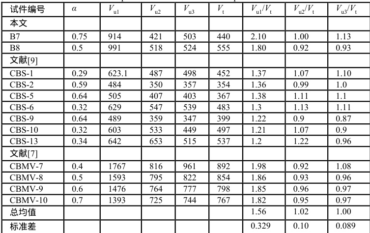 注:其中 Vu1、Vu2、 Vu3 分别为文献[9]公式、文献[7]公式、本文提出的抗剪计算公式计算所得, Vt 抗剪承载力试验值