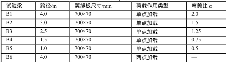 本试验采用 6 片相同截面尺寸的简支组合梁开展弯剪性能试验研究。试验梁 B1~B5 采用跨中单点方式加载、调整各梁跨径使其弯剪比不同,跨径分别设定 1m,1.5m,2.5m. 、3m 和4m 五种,弯剪比大小依次分布为 0.5、0.75、1.25、1.5 和 2.0。同时为对比剪力大小对抗弯承载力的影响,又设计了 1 片两点加载下纯弯受力状态的试件 B6 以对比,如图 5 所示。各试验梁的参数列如表 1 所示。