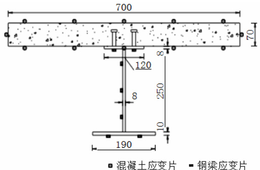 本文模型梁梁高均为 338mm , 钢梁部分高 268mm 、翼缘板尺寸为 700×70mm ,截面形状尺寸布置如图 3 所示。腹板位置处焊接 8mm 厚加劲肋以防止支点位置和加载位置处腹板发生局部屈曲。剪力连接件方面,采用双排栓钉横向间隔 60mm 布置。其中,栓钉的规格为Φ13.53 。混凝土板的上下缘分别布置了 6 根纵向钢筋,横向钢筋沿纵向均匀排列,钢筋外径 8mm。