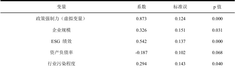,表明大型企业披露意愿更强;ESG 绩效(商道融绿评级)系数为 0.542 (p<0.01) ,显示高绩效企业更愿意披露。