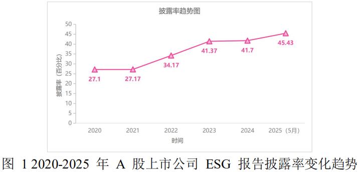 2020-2025 年 A 股 ESG 报告披露率呈持续增长态势,从 27.1% 升至 45.43% ,年均增长 3.7 个百分点。分阶段看,2020-2023 年为缓慢增长期,年均增幅 2.3 个百分点;2024 年强制政策落地后进入加速期,单年增幅达 0.33 个百分点;2025 年延续增长趋势,截至 5 月已达 45.43% (见图 1)。