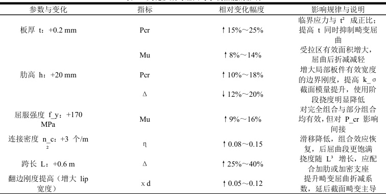 ,跨长 L=2.2~3.6m 。采用板条法与有效宽度折减进行参数化计算,关心初屈曲荷载 P_cr、极限弯矩 M_u 与跨中挠度 Δ 的变化趋势。结果以相对增减率呈现。