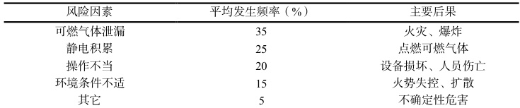 油气田场站在运行时动火作业是高风险活动且潜在安全隐患不能小看,近五年统计数据表明全球动火作业引发的事故在油气行业总事故中占比大概 15%-20% 且火灾和爆炸为主要事故类型,这些事故导致人员伤亡、设备损坏且给环境带来深远影响,系统分析油气田场站动火作业风险因素可知主要有可燃气体泄漏、静电积聚、操作失误、环境状况不好等情况且在高温高压环境下这些风险更凸显还容易被外界气象条件所影响,比如湿度低或者风速大的时候静电火花出现的概率会大大增加,为了更清楚地呈现风险源及其对应的频率就把数据整理成像表 1 这样的形式。
