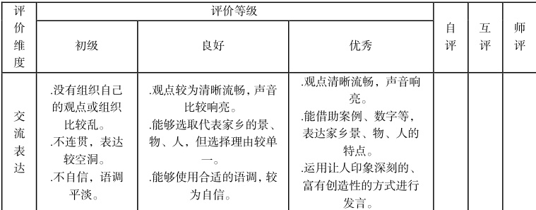 评价是道德与法治教学的重要环节。课标强调要突出实践性评价的重要性,通过推动学生实质性成长即“增值效应”,最终达成理论与实践的统一。在项目式学习实施过程中,我们依据课标制定科学的评价标准,并将其与具体的学习任务相结合,从而有效推动学生实现学业进步与综合能力的提升。在“请到我的家乡来”项目化学习中,我们围绕“我为家乡代言之制作游遍芦淞旅行手册”这一任务的开展,分为合作探究、阅读思考、交流表达等评价维度,设计评价量表,以“交流表达”这一评价维度为例,(见表 1)这一评价维度着重评价学生阐述自己制作游遍芦淞旅行手册的观点表达,深化政治认同与责任担当等核心素养。