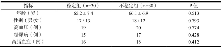 共纳入 60 例患者,其中稳定斑块组 30 例、不稳定斑块组 30 例。两组在年龄、性别构成及高血压、糖尿病、高脂血症等基础疾病方面差异无统计学意义( P>0.05 ),具有良好的可比性。详见表 1