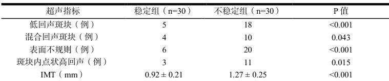根据斑块的临床表现及超声影像特征,参照既往研究标准及文献资料,将患者分为稳定斑块组(30例)与不稳定斑块组(30 例)。