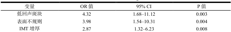 对影响斑块稳定性的主要超声指标进行 Logistic 回归分析发现,低回声斑块、表面不规则及 IMT增厚均为独立危险因素,OR 值分别为 4.32、3.98 和 2.87,差异具有统计学意义( ⋅P<0.01) 详见表 3