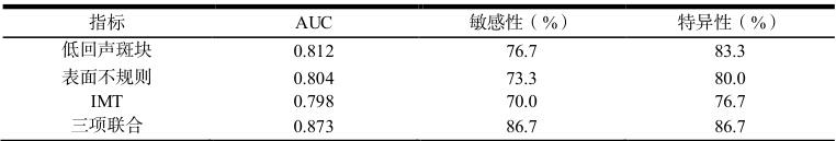 将低回声斑块、表面不规则和 IMT 等单项及联合指标进行 ROC 曲线分析。结果显示,三项指标联合预测不稳定斑块的 AUC 达 0.873,优于各单项指标,具有更高的灵敏度和特异性(均为 86.7% )。详见表 4。