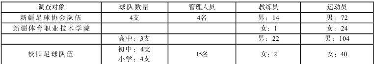 24 人,新疆足协男子 U17 共 24 人,新疆足协男子 U15 共 24 人。新疆体校女子 U17 队伍共 24 人。另一种是校园足球队伍分别是高中队伍共 3 支和初中队伍 4 支,其中,高中队伍分别是乌鲁木齐 114 中学男子足球队共 20 人,喀什六中男子足球队共 21 人,阿图什男子足球队共 21 人。初中队伍乌鲁木齐 117 中学男子足球队共 21 人,乌鲁木齐第三中学男子队伍共 21 人,和田市第五中学女子足球队共 20 人,石河子十六中学女子足球队共 20 人。问卷的发放和收回方面男性运动员发了 176 份问卷,收回 159 份问卷。女性运动员发了 64 份问卷,收回 55 份问卷。对运动员调查实现全覆盖。