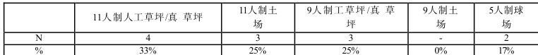 从表 8 可以看出,本研究所涉及到的 18 个队伍的场地数量共 12 块。人工 草坪/草坪场地占总数的 58%,土场占总数的 25% ,还有 2 个五人制水泥地足球场。平均每支队伍拥有 0.6 块足球场。场地设施不是很好。而且大部分场地是当地学校的场地。