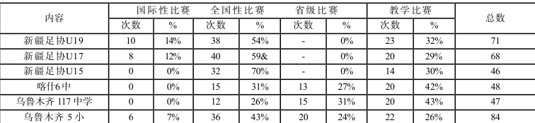 杨浩(2006)在《新疆维吾尔自治区足球后备人才培养现状的调查研究》文章中指出新疆青少年队伍每年参加足球比赛的数量太少,尤其是与内地足球水平较高的青少年球队比赛的机会少,运动水平滑坡严重,不利于新疆青少年足球运动员的成长和发展,所以增加比赛数量和质量。