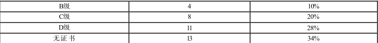 目前亚足联和中国足球协会共同规定的教练员等级分为 5 个级别。分别是职业级教练员、A 级教练员、B 级教练员、C级教练员和 D 级教练员。本研究中新疆优秀足球运动员所在队伍的教练员的拥有的教练员等级证书也是一个非常重要的研究标准。下面我对新疆优秀足球运动员所在队伍教练员的教练员证书进行调查分析。
