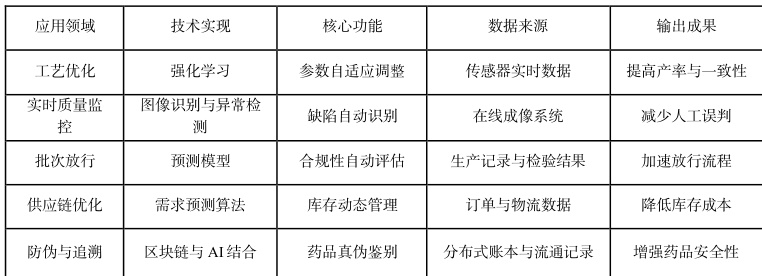人工智能在制药制造与质量管理环节的应用,正推动生产方式向智能化、连续化和高精度方向转型。其通过实时数据处理与模型优化,显著提升生产效率和产品质量一致性。