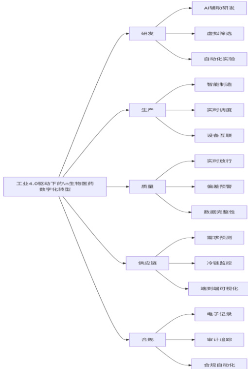 本文系统研究了工业 4.0 背景下生物医药企业数字化战略的总体目标、关键技术与实践路径,明确了数字化转型在提升研发效率、生产智能化、质量可靠度、供应链韧性及合规水平方面的核心价值。研究表明,通过系统化实施人工智能、制造执行系统、数字孪生和区块链等关键技术,企业可实现全链条数据的集成管理与智能应用,进而优化资源配置,加速创新转化。未来,行业需持续推动技术迭代、标准共建与人才培养,以实现数字化向智能化的跃迁。该研究为生物医药企业提供了可行的数字化实施框架,对推动行业高质量、可持续发展具有重要实践意义。