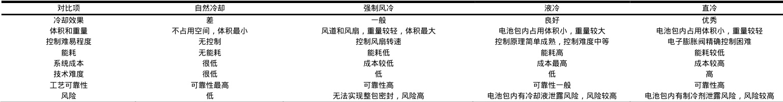 常见的动力电池冷却方式有空气冷却、液冷、直冷、相变材料冷却、热管冷却、复合冷却等。目前在汽车动力电池上大规模量产应用的主要有空气冷却、液冷和直冷技术,强制风冷常见于储能系统和早期纯电动大巴车。热管冷却、相变材料冷却、复合冷却尚处在实验室研究阶段,并无实现大规模量产应用。如表 1 所示,不同冷却技术具有各自的优缺点,电池热管理系统设计者们应结合电芯发热量、系统成本、使用工况及电池包内空间等因素综合考虑,选择合适的电池冷却方式。
