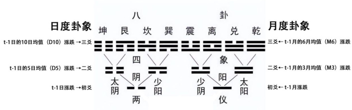 本研究的预测标的有两个:(1)日度:根据t-1 日及过往数据,预测t 日收益率的相对高低;(2)月度:根据t-1 月及过往数据,预测t 月收益率的相对高低。因此卦象的提取方式也有两个,这里先说明一个卦的形成过程(《周易本义》,朱熹):一个卦,总共有 3 根爻,每根爻有阴、阳两种可能,先生成的是最下方的爻:初爻;再形成中间的二爻;最后形成最上方的三爻。总共有八个卦。(1)对于日度数据,t 日的卦:t--1日涨,则初爻为阳、跌为阴; t--1 日的5 日均值(D5)涨,则二爻为阳、跌为阴; t--1日的 10 日均值(D10)涨,则三爻为阳、跌为阴。(2)对于月度数据,t 月的卦:t--1月涨,则初爻为阳、跌为阴; t-1 月的3 个月均值(M3)涨,则二爻为阳、跌为阴;t--1 月6 个月均值(M6)涨,则三爻为阳、跌为阴。如图 1 所示:例如某股指,t-1 日跌,t-1 日的5 日均值涨,t-1 日的 10 日均值跌,初爻为阴、二爻为阳、三爻为阴,则该股指t 日对应的卦象为坎卦。