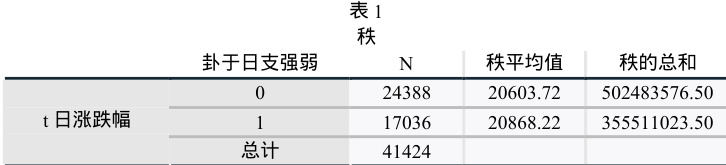 为验证假说1,本文采取Mann-Whitney 检验,对分别在卦强日和卦弱日的股票指数收益进行考察,如表 1、表 2 所示,其中 t 日涨跌幅=(t 日收盘价-昨日收盘价)/昨日收盘价,卦于日支强弱:0 为卦弱日、1 为卦强日。由此可见,卦强日的平均收益率比卦弱日高,而且是显著的( p=0.027<0.05 ),假说1 得到验证。