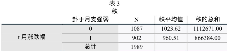 为验证假说2,本文采取Mann-Whitney 检验,对分别在卦强月和卦弱月的股票指数收益进行考察,如表 3、表 4 所示,其中 t 月涨跌幅=(t 月收盘价-上月收盘价)/上月收盘价,卦于月支强弱:0 为卦弱月、1 为卦强月。由此可见,卦强月的平均收益率比卦弱月低,而且是显著的( p=0.015<0.05 ),假说2 得到验证。
