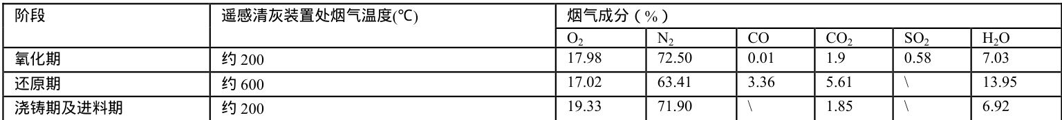 阳极炉在不同阶段烟气温度及成分差别较大,如表 1。在阳极炉还原期间,存在部分未利用的天然气直接进入烟道内二次燃烧,导致该阶段阳极炉烟道热负荷偏大,且还原期和其它时期烟气的温差较大。其次,阳极炉烟道采用钢爪 ⋅+50mm 的铝铬浇铸料,与冶炼厂常用砖砌烟道相比,浇铸料更容易受到温差影响而伸缩变形,出现开裂、脱落的情况,影响烟气走向,最终使得烟管钢壳直接与高温烟气接触而坍塌变形。