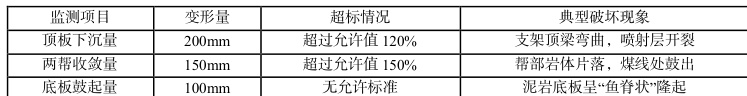 原支护采用“11#工字钢支架+100mm 厚喷射混凝土”方案,支架间距 800mm,棚腿插入底板 300mm,顶部弧形梁与巷道轮廓贴合度不足 70% ;喷射混凝土强度 C20,回弹率达 35% ,局部厚度不足 80mm;未对底板采取支护措施。开挖3 个月后监测数据显示(表2)。