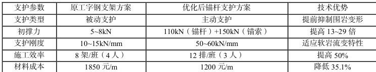 失效原因主要包括工字钢支架为被动支护,初撑力不足(仅 5\~8kN),无法抑制软岩初期变形;支架与围岩非密贴支护,导致应力集中于棚腿与顶梁接点处,70%支架出现腿部压屈;底板无支护,泥岩遇水膨胀引发底鼓,带动两帮位移,形成“底鼓-帮鼓-顶沉”连锁反应。