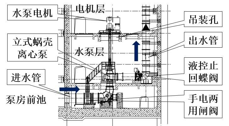 污水调蓄池排空泵房的主要设备包括立式蜗壳离心泵、进水手电两用闸阀和出水液控止回蝶阀,泵房设备布置详见图1。