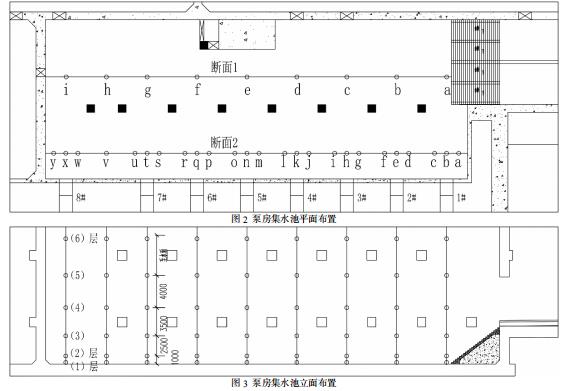 泵站集水池流态分析试验主要通 速分 ,分析泵站运行下的集水池水流状态及其对水泵均匀吸水的影响。试验中,根据集水池的布置特点 利性, 置两个典型流速实测断面,其中,断面 1 上布置9 个测线,断面2 上布置25 个测线(每台 每个 深的不同,分别布置4\~6 层测点。集水池流速测点布置及水泵编号见图2、3 所示。开展不同水泵组合试验。由于水泵台数较多,选取对泵站集水池流态有显著影响的开机组合开展试验。
