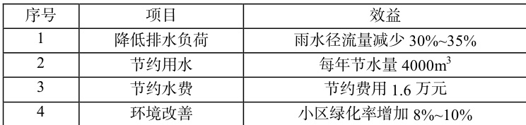 对雨水收集基础设施进行优化设置。结合老旧小区整体空间布局现状、雨水径流基本特点等,进行雨水收集池的合理选址。针对该收集池整体结构,可以采用塑料模块组装、钢筋混凝土等不同结构。在屋面区域,可设雨水斗,可促使屋面雨水被快速引入用于采集雨水的收集池中。同时,在绿地内侧及道路两侧区域,可设用于收集雨水的专用雨水口,利于雨水采集及处理。表1为该系统优化运行后,预测所能够获取的综合效益数据。