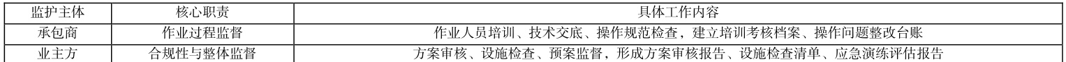 具体而言,承包商监护人员承担着作业人员培训,技术交底和现场操作的规范监督等任务。就作业人员培训而言,既需要基础安全知识的训练,也需要对特定作业项目的专门训练,训练完成之后需要经过评估,评估通过才能上岗。技术交底应细致全面,以保证作业人员对作业流程和安全注意事项有一个清晰的认识。在现场操作规范监管期间,应当建立巡查记录,发现问题应当及时记录在案,督促纠正。