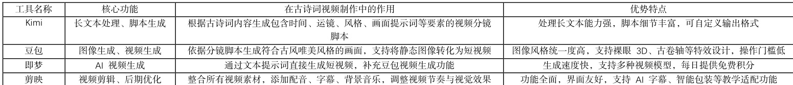 在 AI 演绎古诗词视频制作过程中,不同工具承担着不同的功能角色,各工具的协同配合是实现创作目标的关键。本次实践所选用的工具均具备操作简便、免费易用的特点,适合学生群体快速上手,具体工具及功能如下表所示: