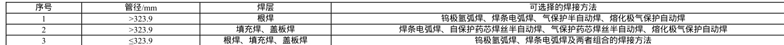 在原油管道的抢修焊接中,最常用的焊接方法之一就是焊条电弧焊。不同的焊接方法都有各自适用的范围,根据管道直径径和焊接层数的不同可以选择合适的焊接方法,如表 1-1 所示。