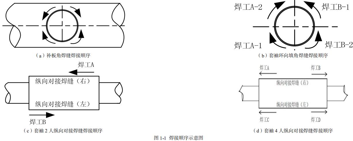 如果焊接顺序选择不当会造成应力集中,从而影响到焊件的强度和性能,导致管道的安全运行存在隐患。通常原油管道抢修会采用焊接补板、套袖、开孔封堵、换管等方式进行修复。无论是补板角焊缝还是套袖环向焊缝以及纵向焊缝焊接顺序的基本原则都是避免应力集中,使焊后残余应力尽可能的小。