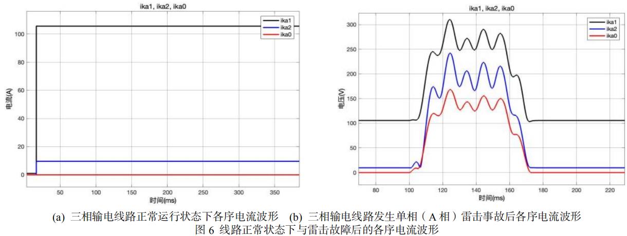 输电线路正常运行状态下的各序电流波形与发生单相(A相)雷击事故后的各序电流波形对比如图6所示。