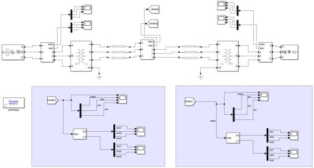 式中:I0为某一大于雷电流幅值的电流值,α 为雷电流波头衰减系数,β 为雷电流波尾衰减系数,只要给定 I0、α、β 的值,就能确定唯一的雷电流波形。本文运用 MATLAB/Simulink 对 10.5 kV 单电源系统分别对于正常运行状况和输电线路发生雷击故障进行仿真,正常状态下双电源系统模型搭建如图1 所示,模拟发生雷击故障后,带有雷电流波形模块的仿真模型如图2 所示。