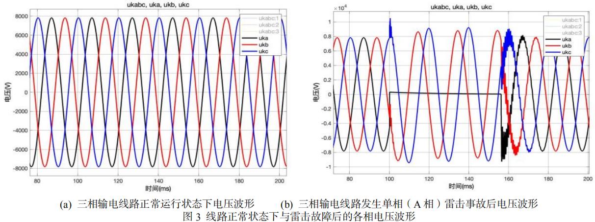 输电线路正常运行状态下的三相电压波形与发生单相(A相)雷击事故后的三相电压波形对比如图3所示。