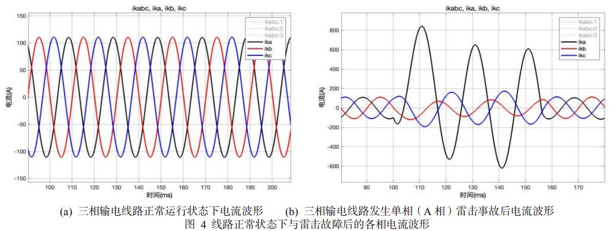 输电线路正常运行状态下的三相电流波形与发生单相(A相)雷击事故后的三相电流波形对比如图4所示。