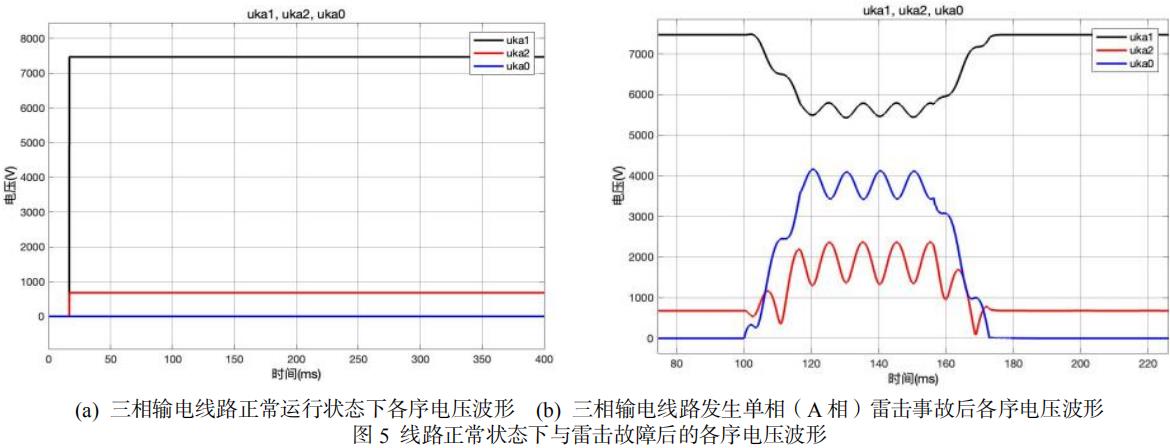 输电线路正常运行状态下的各序电压波形与发生单相(A相)雷击事故后的各序电压波形对比如图5所示。