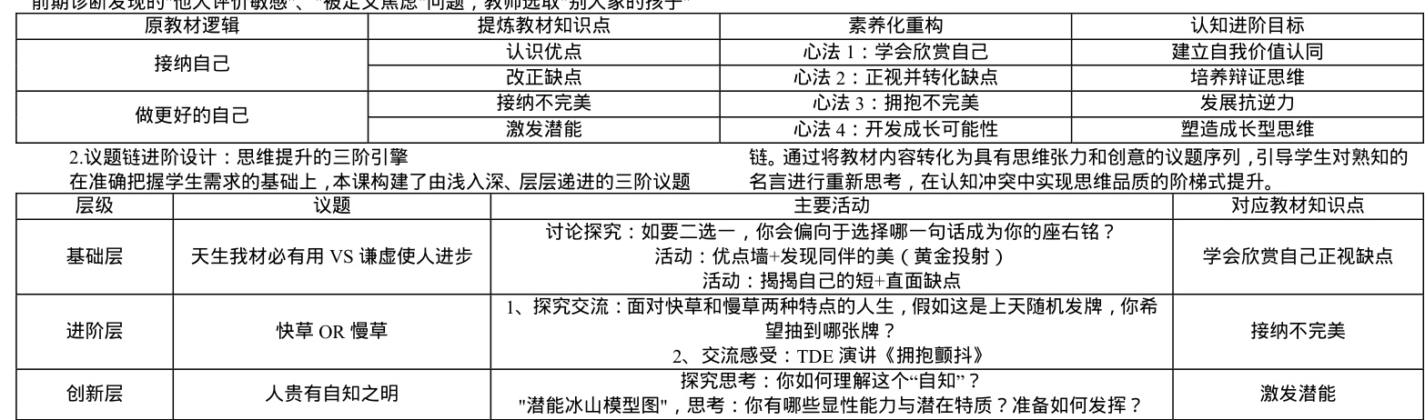 教材将《做更好的自己》划分为"接纳自我"与"发展自我"两个板块,但两个板块的内容有重合的地方,存在一定的逻辑混乱。而本课的核心在于做更好自己的实践路径,因此教师打破“接纳自我→提升自我”的固有结构,重新布局、创新融合,提炼欣赏自己、正视缺点、拥抱不完美、激发潜能四大核心心法,实现清晰的认识递进路径。