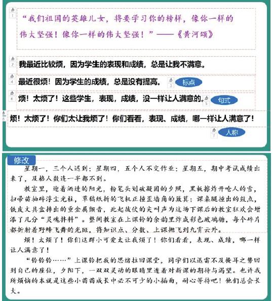 师:没有高下之分。恰到好处地使用即可。接下来就请大家在刚刚写的那一句的基础上进行扩展,写一段 100 字的小短文。写好之后我们一起修改,看看谁的进步更大!