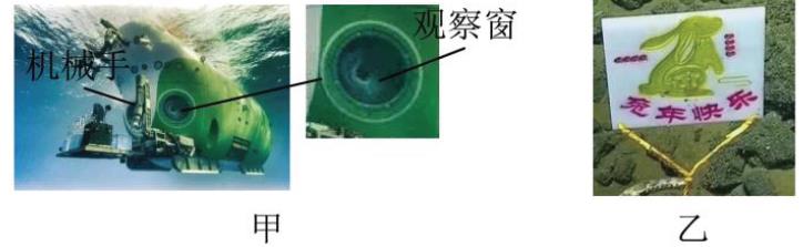(1)“兔年快乐”标志物静置于 5810 m 的深度时,海水对其表面产生的压强是多少?(2)图甲中“奋斗者”号外壳上安装有表面积较小的圆形观察窗。请结合压强相关知识谈谈潜水器为什么设计表面积较小的观察窗?
