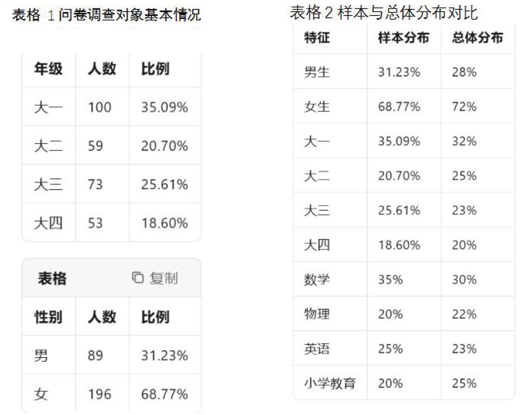 本研究选取广西科技师范学院数学、物理、英语及小学教育等师范类专业的学生作为调查对象。为了确保样本的代表性和数据的可靠性,采用分层随机抽样的方法,从不同年级(大一至大四)中随机抽取若干班级的学生进行问卷调查。本次调查问卷通过问卷星随机发放,最终回收有效问卷285 份。