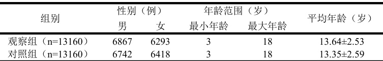 将宜昌市5 区8 县部分幼儿园和中小学校的26320 位儿童青少年,随机分为观察组、对照组,各13160 人。两组青少年儿童的资料如表 1 所示: