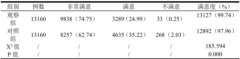 在护理满意度方面,观察组为 99.74% ( 13127/13160 ), 对 照 组 为 97.96% (12892/13160),观察组明显高于对照组,有统计学意义, P<0.05 ;见表 2.