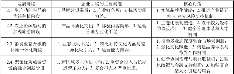 基于前述对休闲观光农业四阶段模型中每阶段剖析,为更系统、直观地呈现其演进与问题策略对应关系,对阶段企业面临的常见问题及相应发展策略进行归纳总结。