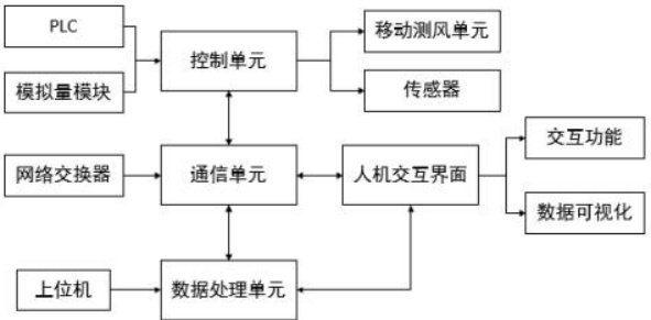 控制单元以PLC(可编程逻辑控制器)为核心,配备模拟量输入模块,负责系统控制与运行管理;通信单元采用网络交换机,基于ModbusTCP 协议实现设备间高效数据交换与远程监控,保障实时通信;数据处理单元依托高性能计算机,进行数据处理、分析及存储,确保数据传输与保存;数据采集模块包括移动测风单元和风速传感器。