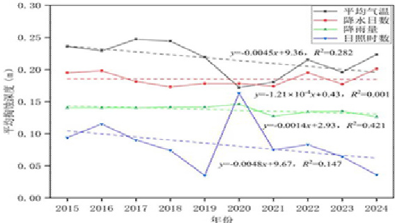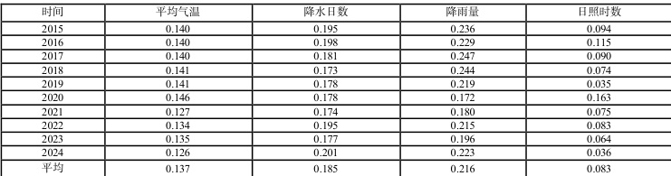次为降水日数、平均气温、日照时数的影响相对较弱,各要素按影响程度从大到小依次排列为:降水量>降水日数>平均气温 ;> 日照时数。