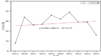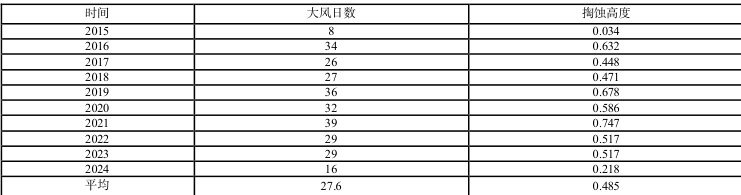 然而,近年来极端气象事件的频发及暴雨集 大风季节的时空分布变异,仍对遗址保护构成潜在威胁。尽管降水日数整体减少,但极端暴雨事件的短时强冲刷力可能加剧局部掏蚀;大风天气是影响长城表面风化和掏蚀病害的重要因素,其季节分布的集中化可能导致特定时段内风沙磨蚀作用的叠加效应。尽管当前气候环境 护存在积极一面,但气候变化的复杂性与不确定性仍不容忽视,未来需通过长期动态监测与机制研究,精准识别极端事件的影响阈值,为盐池明长城土遗址的针对性保护措施优化提供科学支撑。